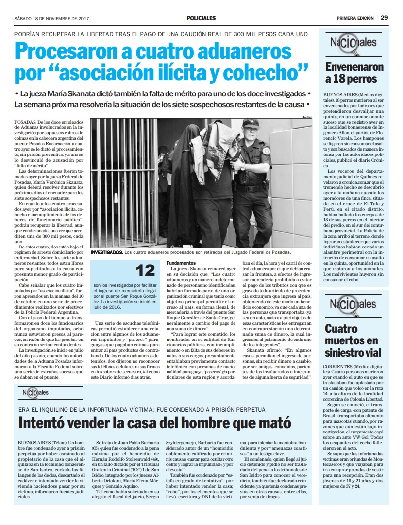 Los funcionarios públicos fueron escuchados durante casi un año antes de ser aprehendidos por orden de la jueza Federal de Posadas, María Verónica Skanata. Se los acusa de haber formado parte de una estructura montada para cometer delitos en la denominada “zona primaria aduanera” con la complicidad de “paseros” y miembros de fuerzas de seguridad, de acuerdo a informes, documentaciones, escuchas telefónicas y mensajes de textos incluidos como material probatorio y que en un primer momento de la pesquisa involucraron como sospechosos a una docena de aduaneros.