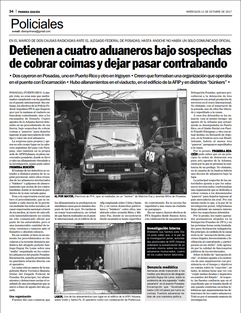 Durante la mañana de este día, la cabecera del puente internacional fue copada por efectivos de la Policía Federal Argentina que llegaron hasta allí pero no buscaban descubrir un contrabando, sino a los encargados de frenarlo, los cuatro agentes de la DGA-Aduana sospechados de cobrar coimas a “paseros” para dejarlos ingresar al país mercadería de todo tipo y valor sin aval alguno.