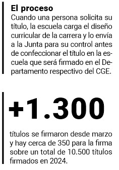 Herrera aseguró que, aunque este inconveniente, desaceleró la entrega de títulos, el equipo continúa trabajando. Recordó que, por un lado, la mayoría de las escuelas tienen sus secretarías administrativas que funcionan en doble turno.