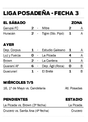 En tanto, en Villa Urquiza y con goles de Axel Cáceres y Carlos Zarza, Brown derrotó por 2-1 a La Cantera. Finalmente, Guacurarí y El Brete igualaron 1-1, mismo resultado que se registró entre Corpus y Galeano.