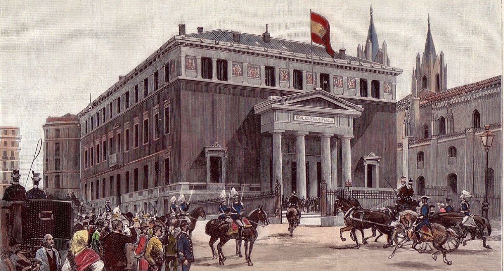 El 7 de mayo de 1891, en Madrid, se coloca la primera piedra del edificio de la Real Academia Española. La RAE se fundó en 1713 por iniciativa de Juan Manuel Fernández Pacheco, marqués de Villena. Felipe V aprobó su constitución el 3 de octubre de 1714 y la colocó bajo su “amparo y Real Protección”. Su propósito fue el de “fijar las voces y vocablos de la lengua castellana en su mayor propiedad, elegancia y pureza”. El edificio que alberga en la actualidad a la institución, situado en la calle Felipe IV, fue construido especialmente por el arquitecto don Miguel Aguado de la Sierra, en unos terrenos del conjunto del Buen Retiro cedidos por la Casa Real. Se inauguró el 1 de abril de 1894.