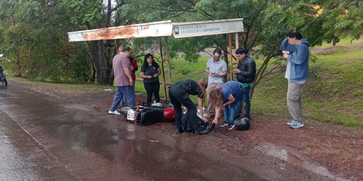 Esta tarde en Posadas,  una mujer que circulaba en una motocicleta Motomel S2 150cc. sobre la ruta  12, a la altura del Parque del Conocimiento,  despistó y cayó inconsciente , en cercanías de una parada de colectivos urbano de pasajeros.