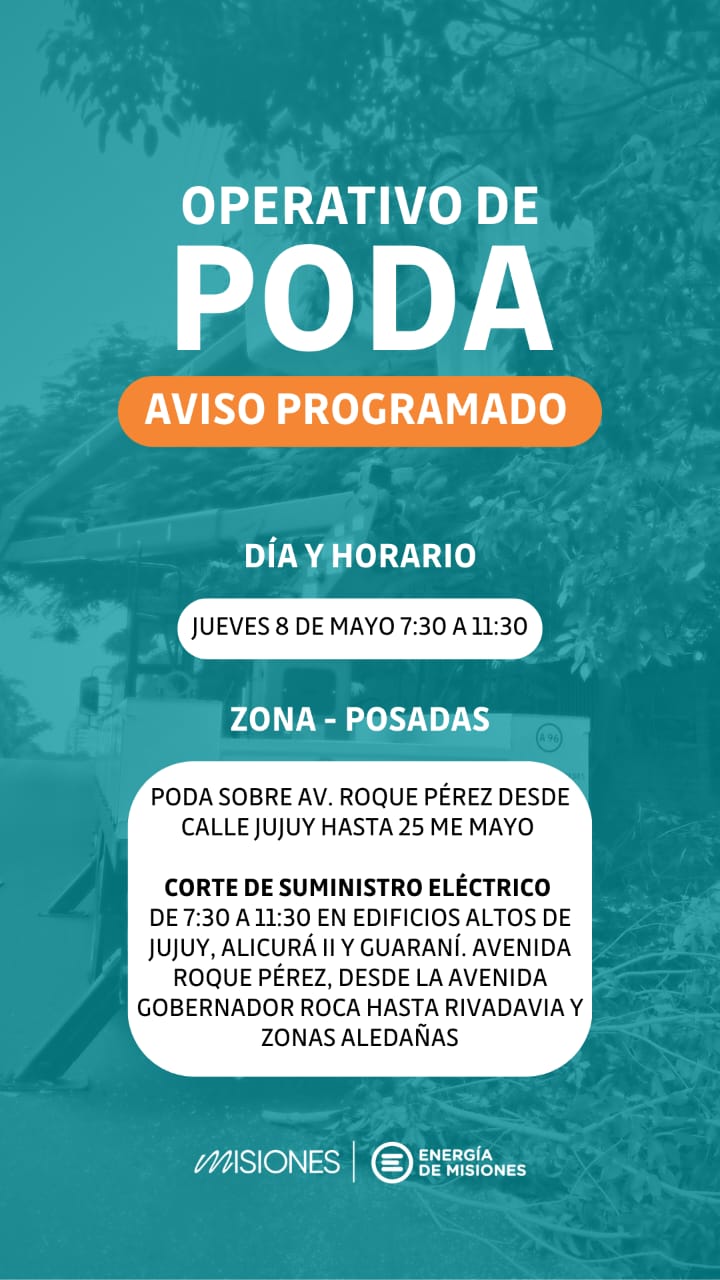 Energía de Misiones informó que este jueves realizará operativo de poda que hace necesaria la interrupción del servicio de energía en distintas zonas de Posadas.