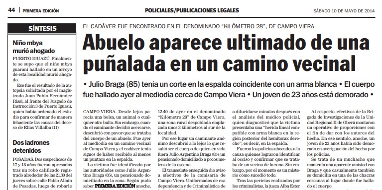 El caso, que se descubrió cerca de las 12:40 del viernes 9 de mayo de 2014 en un camino vecinal del Kilómetro 28 de Campo Viera, conmocionó a Misiones y llegó incluso a los medios nacionales.