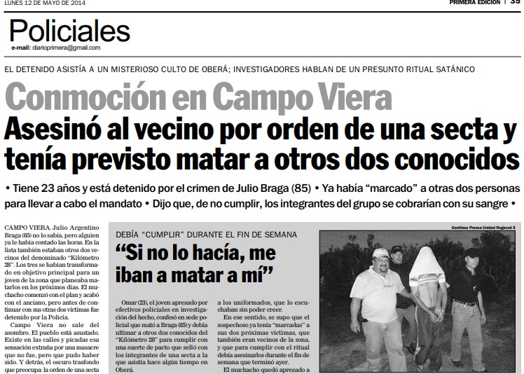 Allí, el joven se quebró. Confesó que había matado de un cuchillazo al anciano y dio a conocer los escalofriantes motivos: no había sido un “ajuste” ni un robo, sino el mandato diabólico de una secta de Oberá a la que asistía y que le había pedido la sangre de tres de sus conocidos.