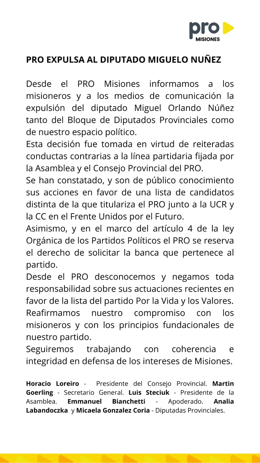 El Consejo Provincial del PRO Misiones oficializó este jueves la expulsión del diputado provincial Miguel Orlando Núñez tanto del bloque legislativo como del espacio político, tras acusarlo de “reiteradas conductas contrarias” a la línea partidaria.
