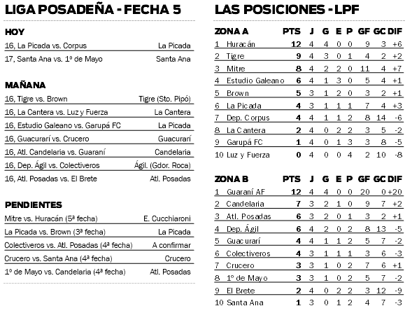 Si todo marcha como está previsto, la Liga Posadeña de Fútbol comenzará a disputar desde hoy la quinta fecha del Torneo Apertura, con dos encuentros en cartelera. En Villa Cabello, La Picada recibirá a Deportivo Corpus, a las 16, en un juego válido por la Zona A. Tanto el Tren del Oeste como el Tricolor se encuentran en mitad de tabla, con cuatro unidades, y urgen de puntos para achicar la brecha con los de arriba.