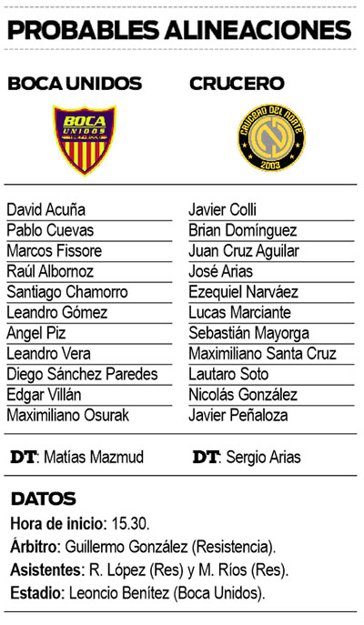 Crucero del Norte buscará hoy, a partir de las 15.30 en el estadio Leoncio Benítez, un soplo de aire fresco cuando se mida ante Boca Unidos de Corrientes. El encuentro, que contará con el arbitraje del chaqueño Guillermo González, enfrenta a dos equipos que comparten la última posición de su grupo y llegan con la necesidad imperiosa de sumar de a tres.