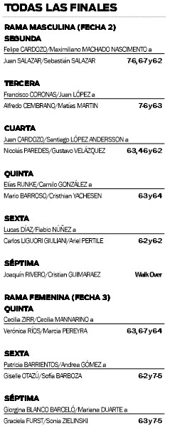 Además, en Quinta, la victoria final correspondió al equipo conformado por los posadeños Elías Runke y Camilo González, luego de derrotar a Mario Barroso y Cristhian Yachesen por 6-3 y 6-4, en otro duelo entre representantes de la capital provincial.