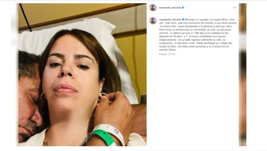 La presentadora Marianela Mirra volvió a aparecer en los medios tras publicar un confuso posteo en sus redes sociales, junto a una íntima imagen de José Alperovich abrazado de ella sobre una camilla de hospital.