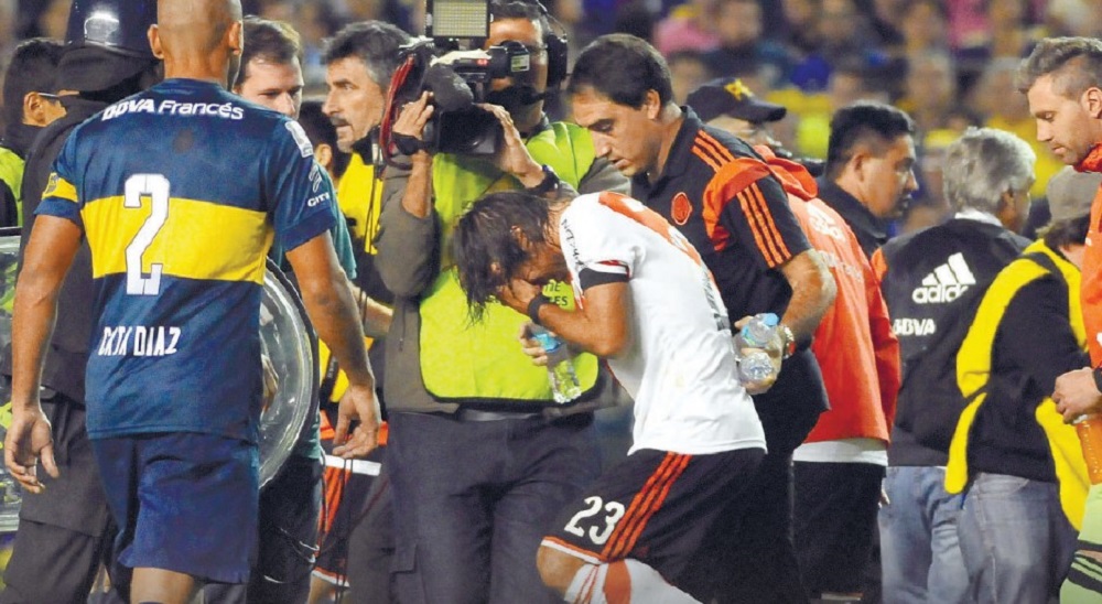 El duelo decisivo llegó al entretiempo con el 0-0 inicial. Y ahí se cerró la puerta futbolística y se abrió la ventana policial. Es que el árbitro Darío Herrera tuvo que suspender el juego por una agresión de hinchas xeneizes a jugadores millonarios cuando salían al campo de juego para disputar los segundos 45 minutos.