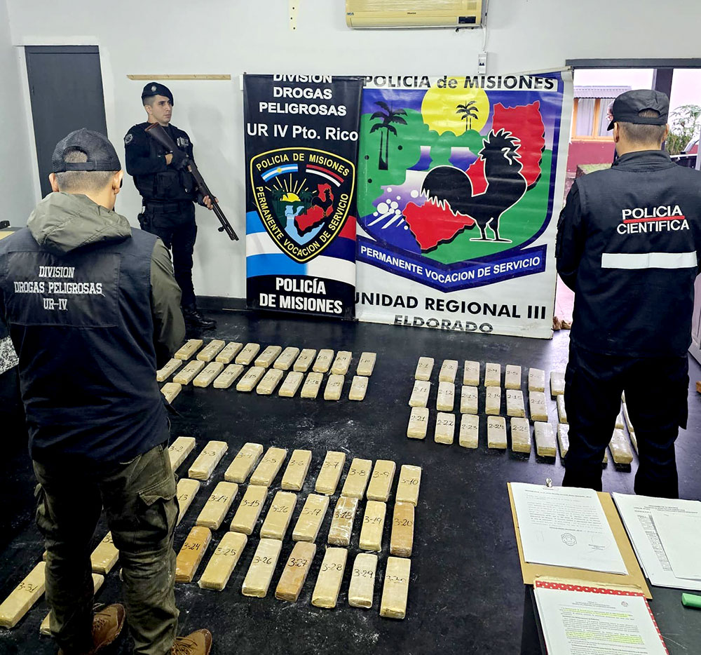 Durante un operativo encubierto realizado en la madrugada de este miércoles en el barrio San José de Eldorado, efectivos de las Divisiones de Drogas Peligrosas de las Unidades Regionales de Eldorado y Puerto Rico secuestraron 84 ladrillos prensados de marihuana listos para su distribución. El procedimiento se llevó a cabo cerca de las 3.15, cuando los efectivos que patrullaban la calle Maipú, próxima al margen sureste del río Paraná, observaron a un hombre que huyó rápidamente al advertir la presencia policial.