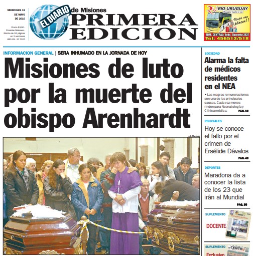 Monseñor Arenhardt, de 61 años, había asumido la recién erigida Diócesis de Oberá el 15 de agosto del año anterior, en 2009, convirtiéndose en el primer Obispo del lugar y en el primer misionero que llegó a un Obispado en su provincia.