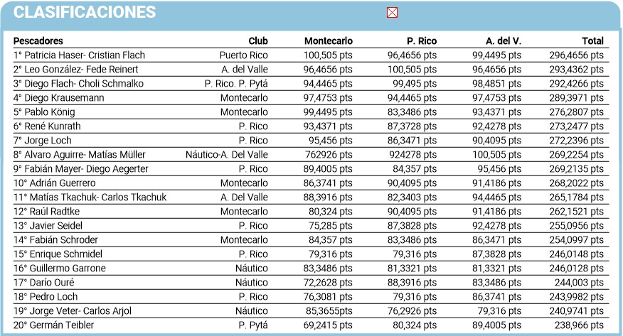 Tomando en cuenta las tres fechas y aplicando el descarte, el liderazgo es de Flach y Haser , pero pasan a ser escoltas Diego Flach y Miguel “Choli” Schmalko, los actuales campeones; y relegan al tercer lugar a Leonardo González y Federico Reinert. Álvaro Aguirre y Matías Müller, los ganadores de la última fecha en Aristóbulo del Valle, se ubican quintos. Y en el cuarto lugar está Diego Krausemann, de Montecarlo, que si bien no ganó, tiene en su haber dos cuartos puestos.