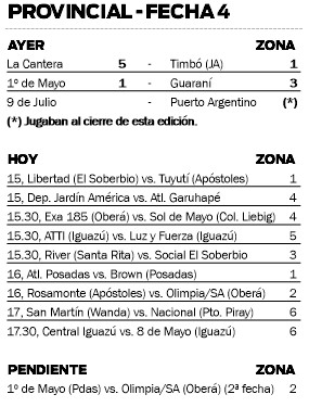 La actividad, siempre y cuando las condiciones meteorológicas lo permitan ya que el pronóstico indica tormentas para hoy, continuará con los siguientes juegos: Atlético Posadas vs. Jorge Gibson Brown (Posadas), Libertad (El Soberbio) vs. Tuyutí (Apóstoles), Rosamonte (Apóstoles) vs. Olimpia San Antonio (Oberá), River (Santa Rita) vs. Social El Soberbio, Exa 185 (Oberá) vs. Sol de Mayo (Colonia Liebig), Deportivo Jardín América vs. Atlético Garuhapé, ATTI (Iguazú) vs. Luz y Fuerza (Iguazú), San Martín (Wanda) vs. Nacional (Puerto Piray) y Central Iguazú vs. 8 de Mayo (Iguazú).