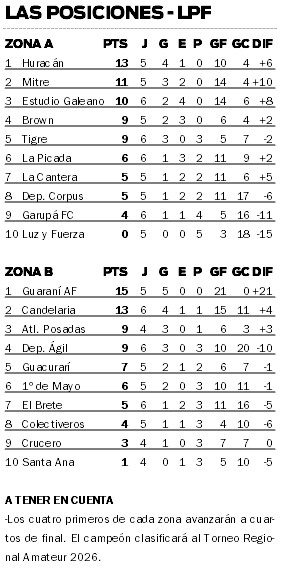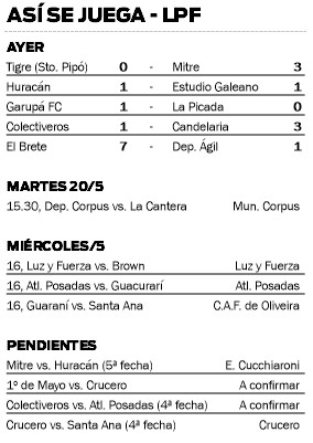 La acción seguirá el martes, a las 15.30, con el duelo entre Deportivo Corpus vs. La Cantera; y al día siguiente se disputarán tres encuentros: Luz y Fuerza vs. Brown, Atlético Posadas vs. Guacurarí y Guaraní vs. Santa Ana, todos a partir de las 16.
