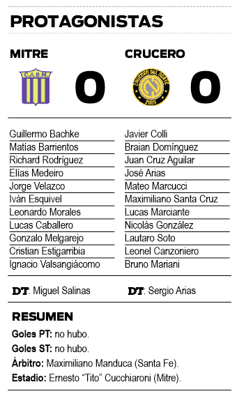 Las más claras de Mitre llegarían sobre el final: a los 38, Elías Medeiro metió un cabezazo que se fue desviado y a los 41, Javier Colli mandó al córner un tiro peligroso de Cristian Estigarribia.
