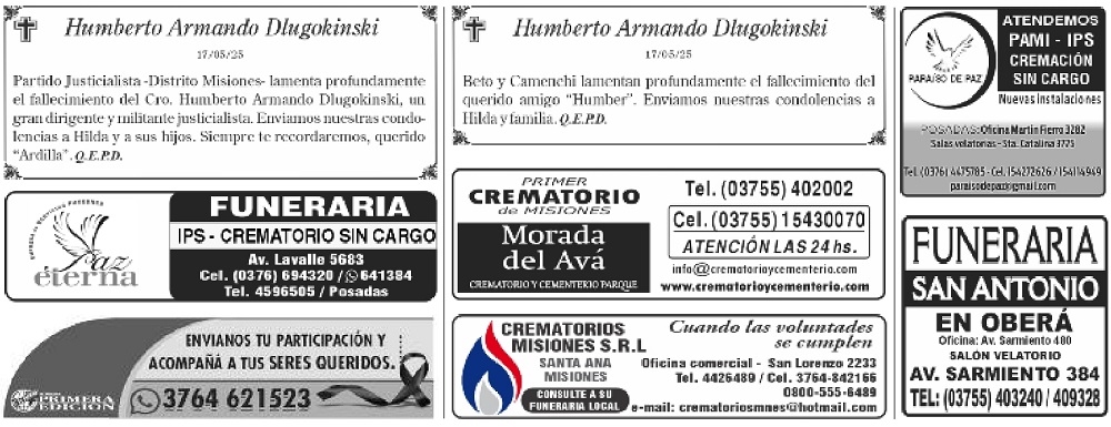 • Fúnebres del Sábado 17 de Mayo de 2025