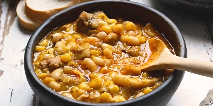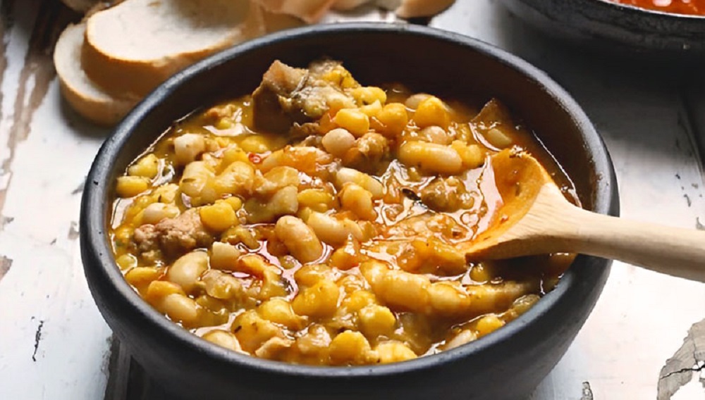 4- Colocar en una olla los porotos y el maíz previamente escurridos. Cubrir con agua hasta 4 dedos por encima de los porotos. Dejar cocinar por una hora y media.