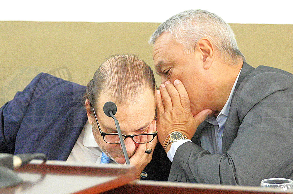 AL OÍDO. Ramón Camargo con extrema reserva le habla a Luis Palma durante la tercera jornada de juicio en el TOF-Posadas.