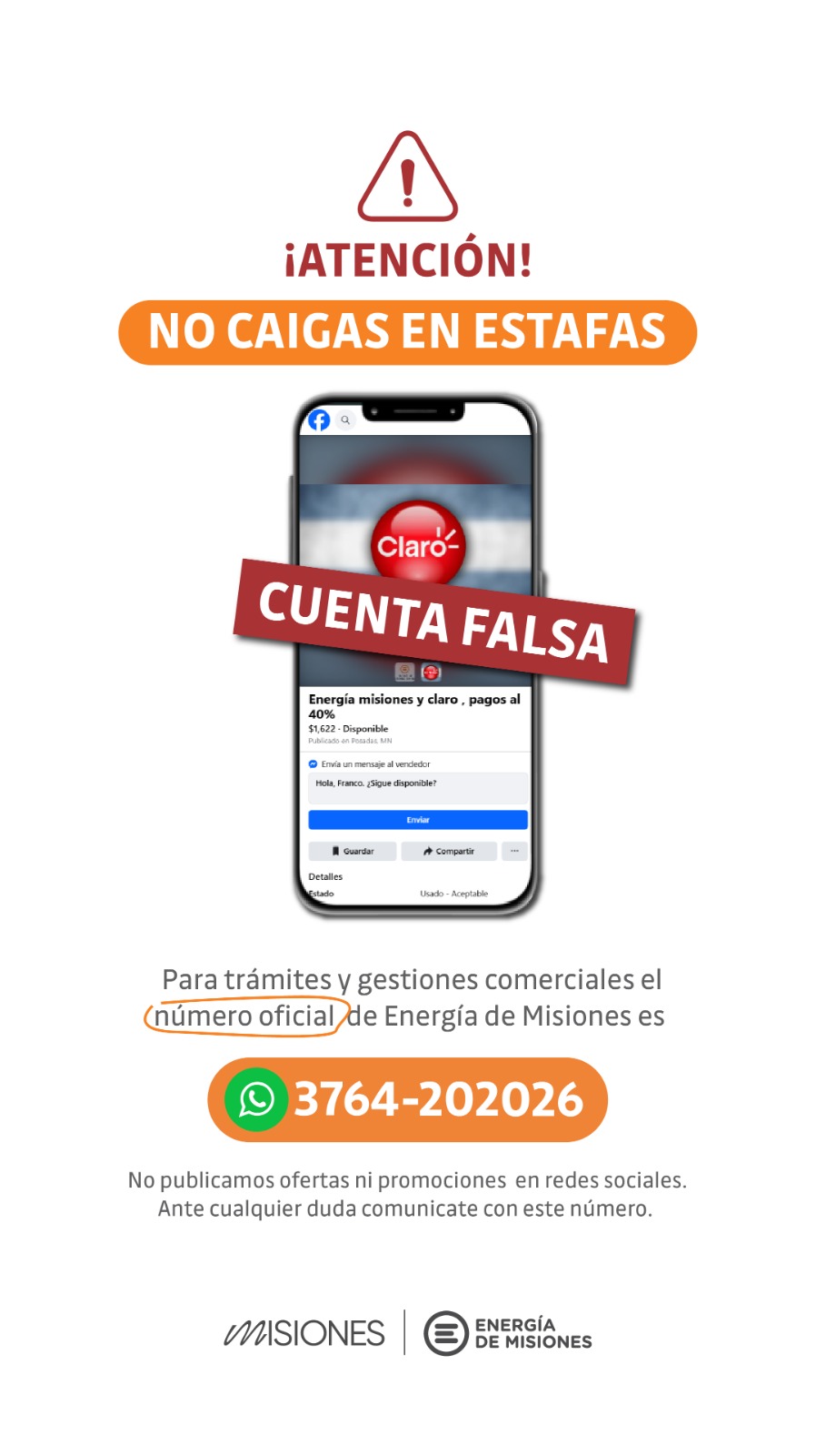 Desde Energía de Misiones, su gerente comercial Ariel Osmar Fernández alertó sobre una serie de intentos de estafa que se están registrando en la provincia. Los engaños se realizan, principalmente, a través de WhatsApp, donde los estafadores se hacen pasar por personal de la empresa para solicitar datos personales, ofrecer falsos descuentos o beneficios, e incluso pedir códigos de validación.