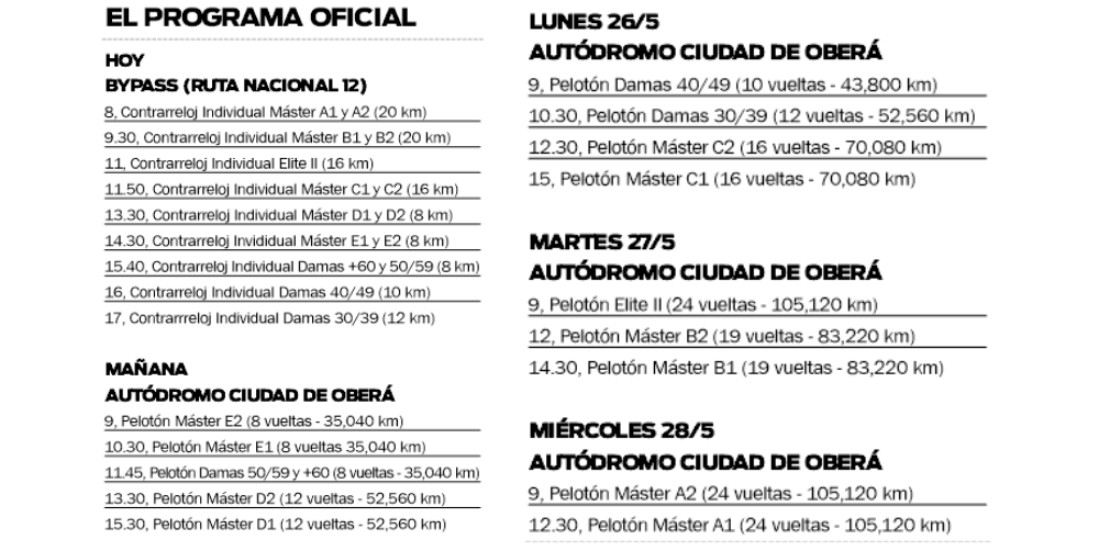 Sin embargo, luego de la jornada deportiva de hoy, toda la acción del Argentino se trasladará al autódromo del Automóvil Club Oberá (ACO), donde desde mañana se pondrán en marcha las competencias de la modalidad pelotón. La actividad se extenderá hasta el miércoles.