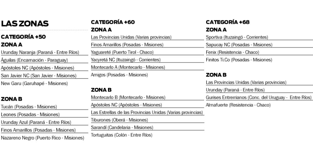 Misiones tiene 14 representantes, con equipos de Posadas, Candelaria, Oberá, San Javier, Garuhapé, Puerto Rico, Montecarlo y Apóstoles. Además también están en competencia equipos de Chaco, Corrientes, Entre Ríos y Encarnación, Paraguay.