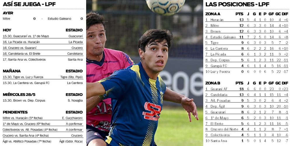 Mañana, en tanto, se desarrollarán otros dos juegos: Tigre de Santo Pipó recibirá a Luz y Fuerza, mientras que La Cantera será anfitrión de Garupá FC. El miércoles completarán Jorge Gibson Brown vs. Deportivo Corpus y quedará pendiente el choque entre Deportivo Ágil y Atlético Posadas.