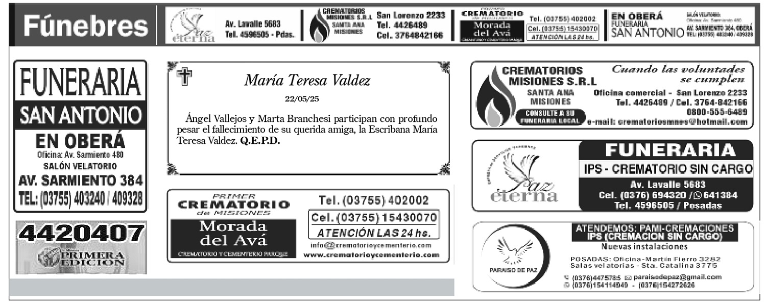 • Fúnebres del Jueves 22 de Mayo de 2025