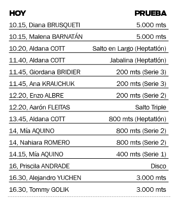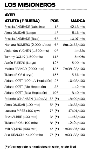 Además, Nahiara Romero fue sexta en los 2 mil metros con obstáculos, con una marca de 8m10s53/100, mientras que Alejandro Yuchen se metió entre los diez primeros en los 1.500 metros, con un registro de 4m33s. Párrafo aparte merece el rendimiento de la posadeña Aldana Cott, quien le volvió a dar representación a Misiones en heptatlón, donde hasta el momento logró resultados más que satisfactorios. Hoy, en el cierre del Nacional U18, también buscará subirse al podio.
