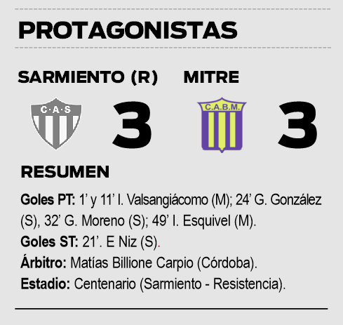 Este duelo, correspondiente a la fecha 11 de la Zona D, se jugó en el estadio Centenario de Resistencia donde Mitre arrancó con todo: a los 12 minutos ya ganaba 2-0 gracias al doblete de Ignacio Valsangiácomo, que anotó al minuto de juego y cuando el reloj marcaba 11.