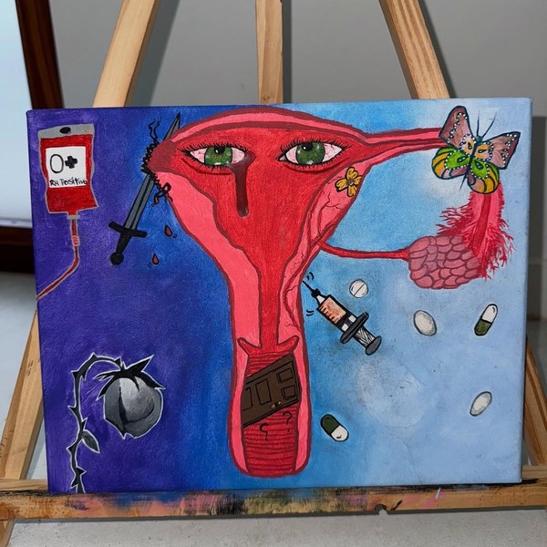 La obra, aún inconclusa, muestra un útero de color rojo intenso con ojos verdes que derraman lágrimas de sangre. Alrededor, se despliegan elementos profundamente simbólicos: una espada que corta una trompa de falopio, una mariposa luminosa en la otra, pastillas, una jeringa, una rosa marchita y una bolsa de transfusión de sangre con la inscripción “0+ RH Positivo”. En el canal vaginal, una puerta y varios signos de interrogación remiten al desconcierto y la incertidumbre vividos.
