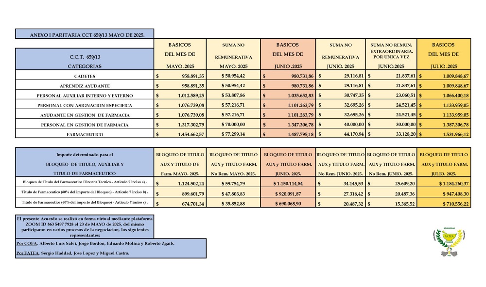 La Federación Argentina de Trabajadores de Farmacia (FATFA) anunció la concreción de un nuevo acuerdo salarial con la Confederación de Farmacias (COFA), que permitirá establecer un incremento en las escalas del Convenio Colectivo 659/13 para los meses de mayo y junio de este año.