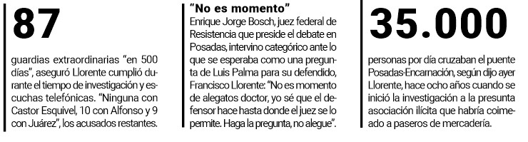 Llorente fue el único de los imputados que aceptó declarar frente a los jueces Enrique Jorge Bosch (camarista chaqueño subrogante), Manuel Alberto Jesús Moreira y Gustavo Fabián Cardozo. De los encartados restantes: Orlando Ariel Alfonso (56), René Lorenzo Juárez (67) y Bernardino Castor Esquivel (51), los dos primeros se abstuvieron, mientras que al último le tocará la oportunidad hoy.