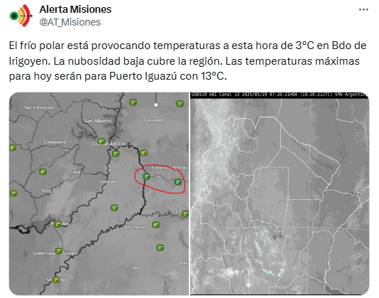 Una masa de aire polar comenzó a ingresar este miércoles a la región y al sur de Brasil, provocando un marcado descenso de temperaturas en la provincia de Misiones. De acuerdo con la Agencia de Alerta Temprana, Bernardo de Irigoyen registró esta mañana apenas 3°C. Ayer, en horas de la tarde, varios municipios registraron entre 5°C y 7°C a las 15, en lo que fue la jornada más fría del año hasta el momento.