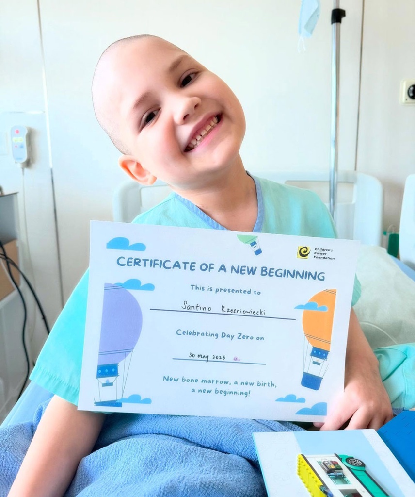 Santino recibió ayer la médula de su papá y su sonrisa y el cartel “De nuevo comienzo” lo dice todo: este primer paso fue como nacer de nuevo, una oportunidad para vivir. Aún falta la segunda etapa del trasplante, prevista para dentro de seis días, cuando el pequeño recibirá las células madre extraídas del cordón umbilical de la donante de Canadá que resultó compatible con nuestro querido guerrero de la tierra colorada.