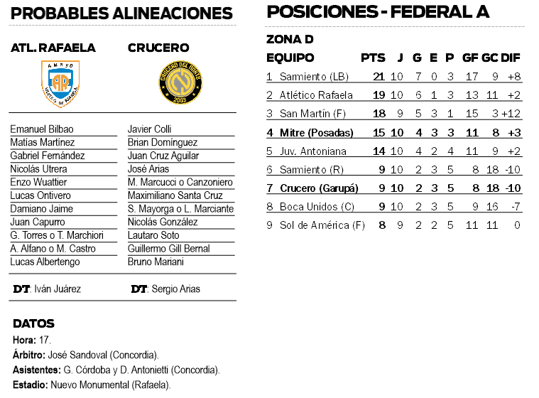 El duelo frente a La Crema será a partir de las 17. El Nuevo Monumental será el escenario de un choque que se presenta como una parada complicada para los misioneros, quienes llegan este importante choque para los misioneros. El árbitro encargado de impartir justicia en este trascendental encuentro será el concordiense José Sandoval.