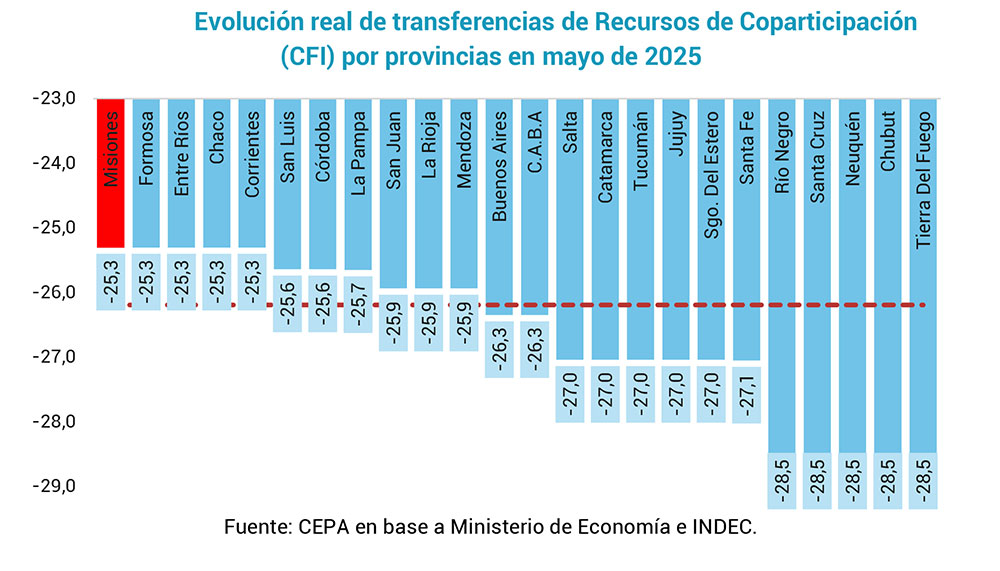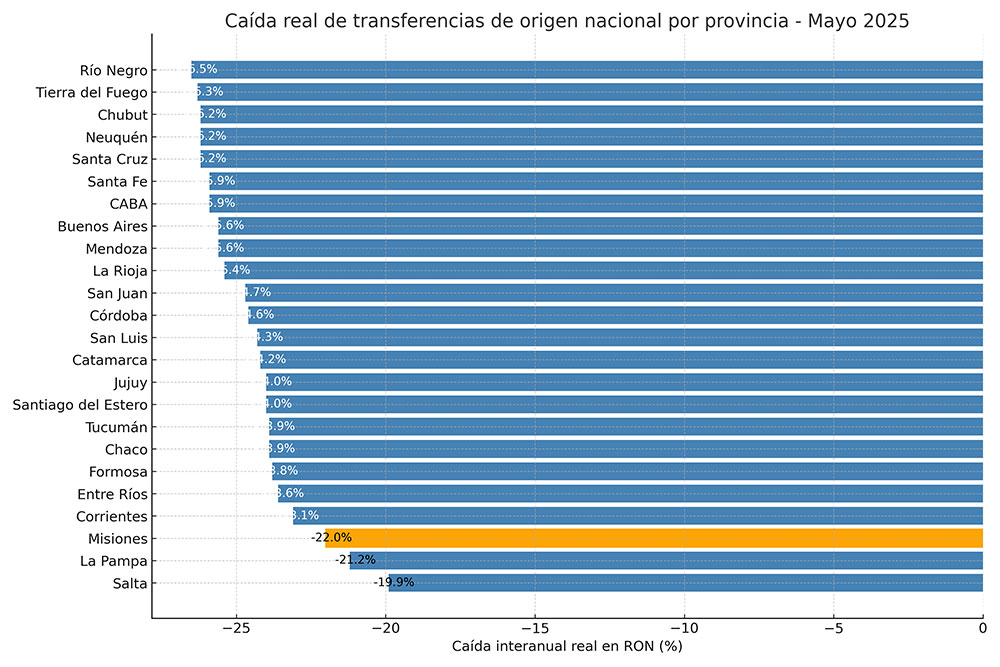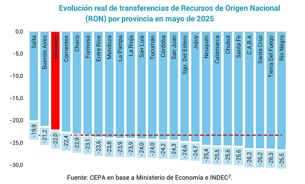 Según el informe del CEPA, el derrumbe interanual del 22% en Misiones forma parte de una tendencia generalizada en todas las jurisdicciones del país, ya que los Recursos de Origen Nacional (RON) registraron en promedio una caída real del 23,3% en mayo de 2025.