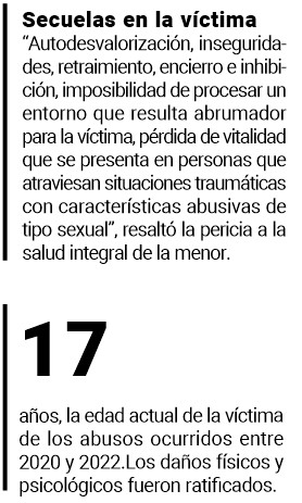 Pero también las conclusiones de las secuelas psicológicas fueron determinantes: “Sentimientos de autodesvalorización, inseguridades, retraimiento, encierro e inhibición evidenciando un estado psíquico que se caracteriza por la imposibilidad de procesar un entorno que resulta abrumador para la misma, como así también la niña presenta indicadores que advierten de una pérdida de vitalidad que se presenta en personas que han vivenciado situaciones traumáticas y de haber sido víctima de situaciones de características abusivas de tipo sexual”, todo ello conforme surge de la pericia psicológica.