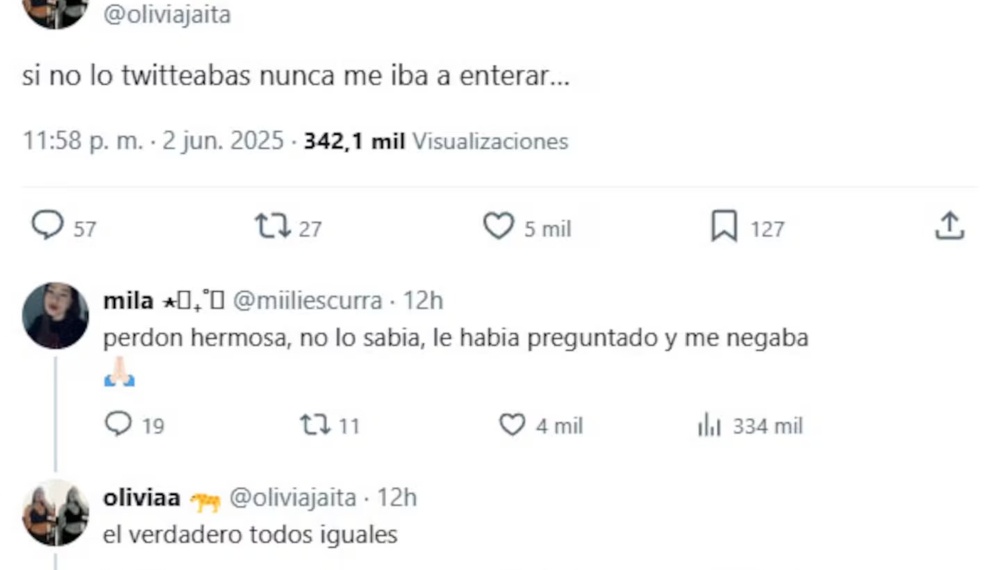El posteo rápidamente se hizo viral y recibió miles de tiernas respuestas hasta que apareció una usuaria llamada Olivia, que aseguró que era la novia del chico. “Si no lo tuiteabas no me iba a enterar”, le respondió.