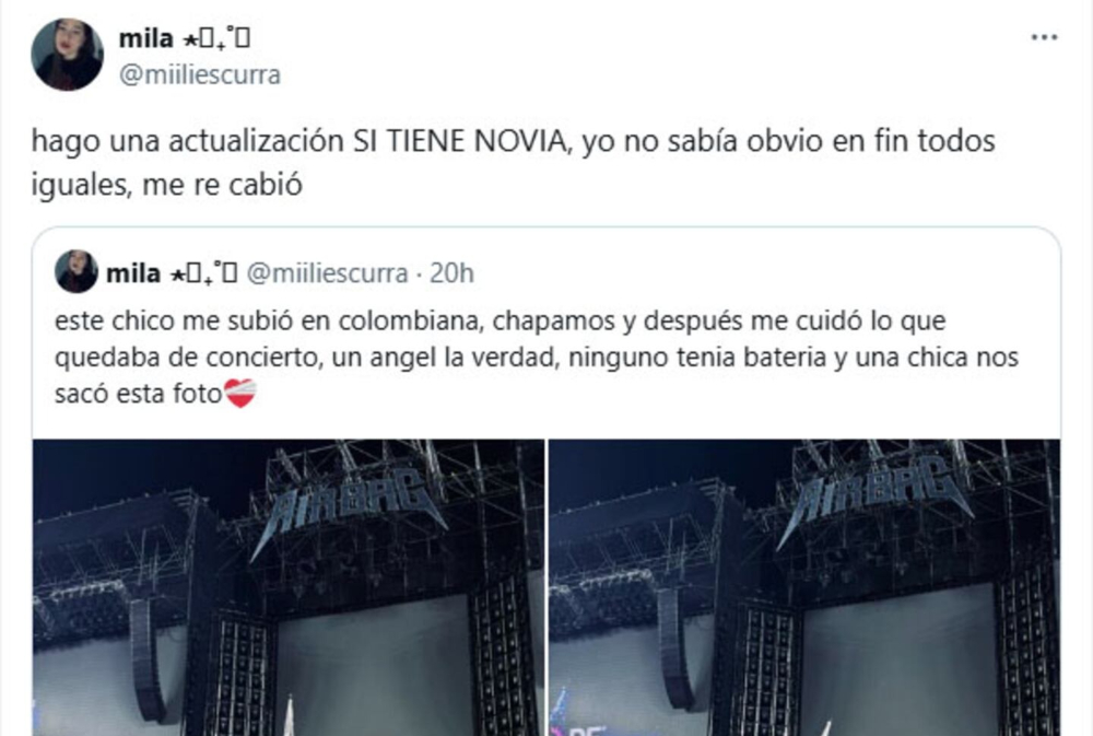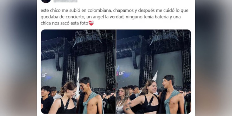 En su cuenta en la red social (ex Twitter) compartió la publicación y las fotos junto al fanático de la banda formada por los hermanos Sardelli. “Este chico me subió en ‘Colombiana’, chapamos y después me cuidó lo que quedaba de concierto, un ángel la verdad, ninguno tenía batería y una chica nos sacó esta foto”, escribió en un tuit acompañado por las imágenes junto al joven.