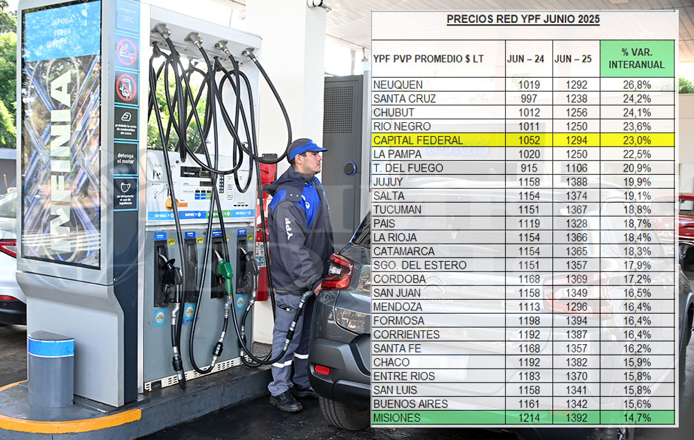 Misiones registró en junio uno de los menores incrementos interanuales en el precio de los combustibles de la red YPF a nivel nacional. De acuerdo con los datos oficiales del Ministerio de Hacienda, el valor promedio por litro en la provincia pasó de $1.214 en junio de 2024 a $1.392 en junio de 2025, lo que representa un aumento del 14,7%. “Esto se logró gracias a las gestiones realizadas por el gobernador Hugo Passalacqua ante las autoridades nacionales”, indicaron.