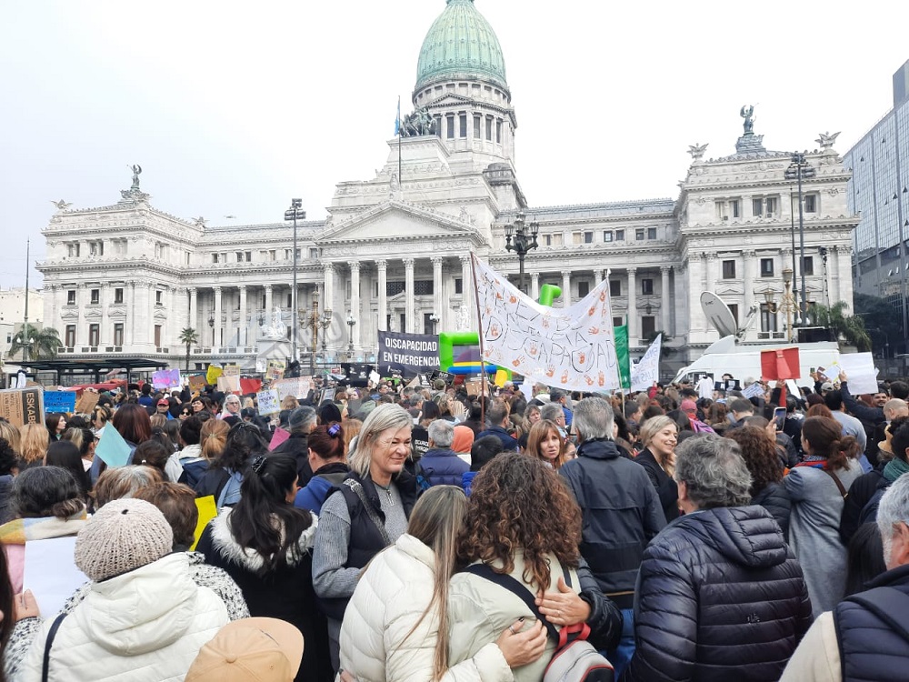 Entre los presentes, Gabriela Reggiardo, directora del Centro Educativo Terapéutico de CABA, institución que trabaja con niños con discapacidad neuromotora contó que “estamos en una lucha desde hace muchísimo tiempo; hoy estamos frente al Congreso para que pueda tratarse y salir la ley de Emergencia en Discapacidad”.