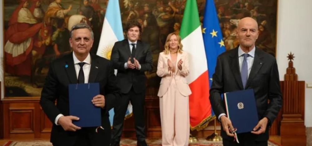 El presidente Javier Milei y su par italiana, Giorgia Meloni, supervisaron hoy la firma del acuerdo entre las compañías energéticas YPF y ENI para el desarrollo conjunto de una de las fases del proyecto “Argentina LNG”.