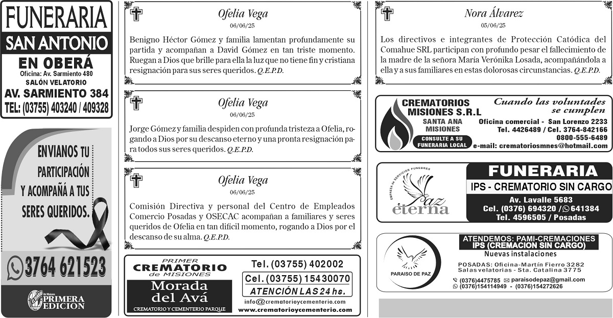 • Fúnebres del Sábado 7 de Junio de 2025
