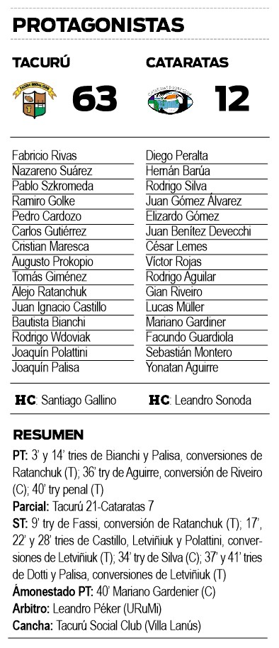 Seguidamente, Tacurú respondió con tries de Luciano Dotti y Palisa (a los 37 y 41) para con las conversiones de Letviñuk cerrar el resultado en 63-12 y festejar un nuevo campeonato.