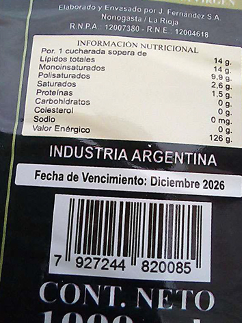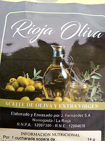 En la misma disposición, ANMAT también prohibió la venta del “aceite de oliva y extra virgen marca Rioja Oliva”, supuestamente producido por J. Fernández S.A., en Nonogasta, La Rioja. Este producto también presentaba etiquetas apócrifas, utilizando números de RNE y RNPA que no existen en el registro oficial.