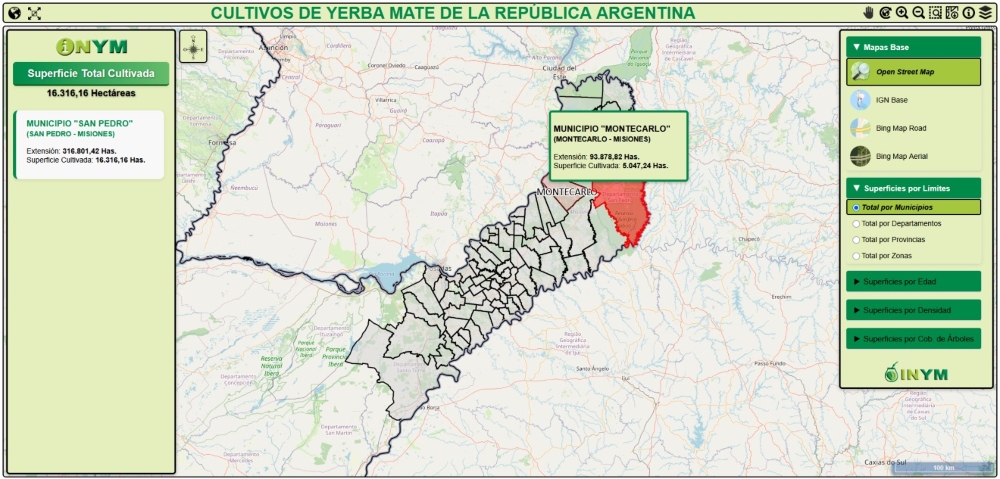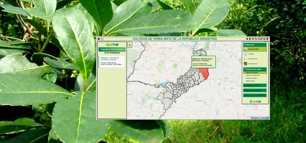 El mapa interactivo, denominado Cultivos de Yerba Mate de la República Argentina, permite visualizar, por zona productora, por provincia productora (Misiones y Corrientes), por departamento y por municipio, la superficie, edad y densidad de las plantaciones, además de la cobertura arbórea nativa y/o forestación existente en los yerbales.