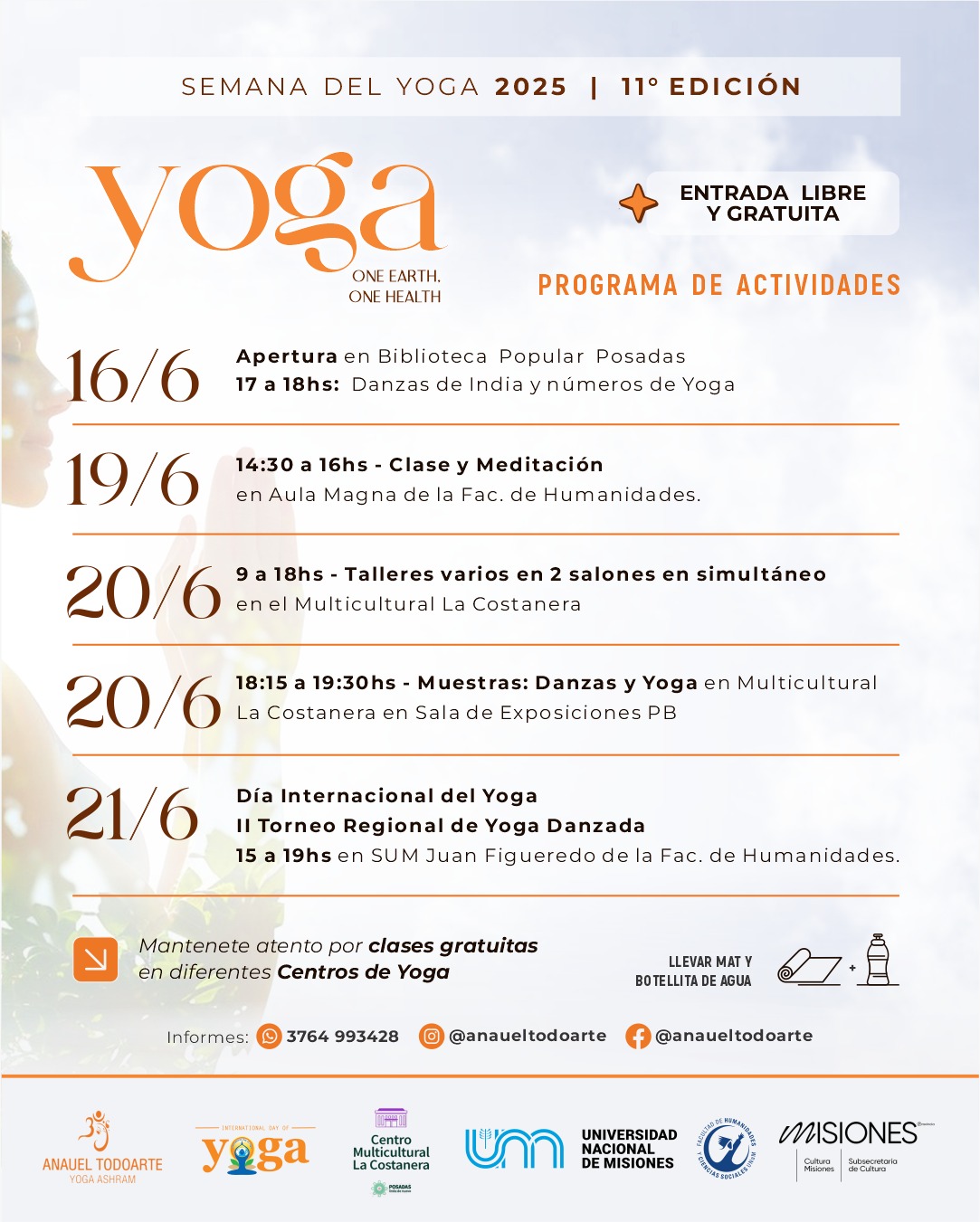 Desde este lunes 16 hasta el sábado 21 de junio, Misiones será escenario de la XI edición de la Semana del Yoga, una celebración que combina espiritualidad, salud y cultura. Organizada por la academia de formadores Anauel Todoarte junto a la Secretaría de Estado de Cultura de la Provincia, la propuesta busca difundir los beneficios del yoga y otras disciplinas holísticas a través de clases abiertas, talleres gratuitos y presentaciones artísticas.