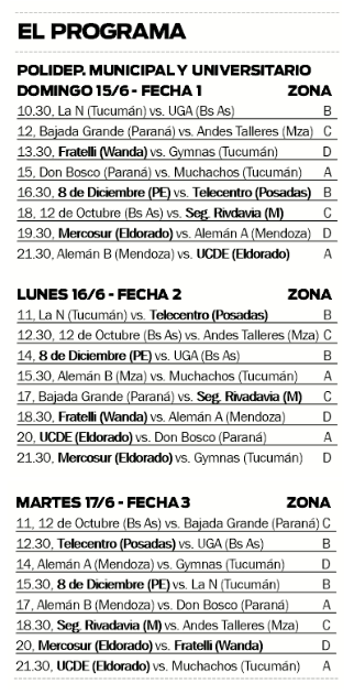 El certamen contará con 16 clubes de toda la región, entre los cuales habrá seis misioneros. Se trata de Fratelli (Colonia Wanda), 8 de Diciembre (Puerto Esperanza), Telecentro Tacuarí (Posadas), Seguros Rivadavia (Montecarlo) y los eldoradenses Mercosur y UCDE.